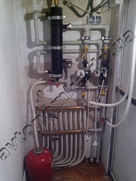 На данном объекте (частный дом в поселке Юбилейный) была проведена переделка автономного отопления. Переделывалась система труб под котлом и коллектор.